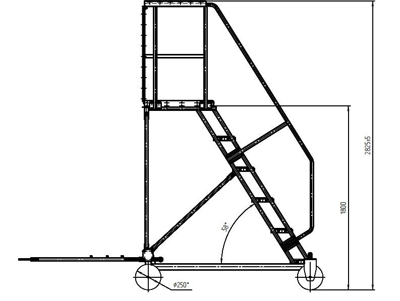 Колёсная база – 2÷4 колеса, расположенные на крайних углах рамы. Диаметр колёс 250 мм, и механизм крепления позволяет быстро и эффективно перекатывать стремянку к следующей рабочей точке.